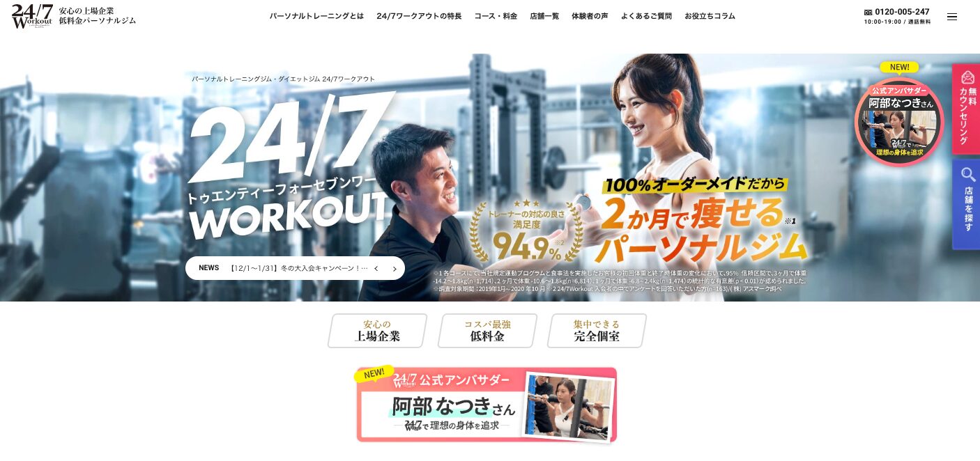 24/7ワークアウト名古屋栄店は、『精鋭トレーナーによる100%オーダーメイドの指導』『深夜24時まで手ぶらで通える』『3食しっかり食べるダイエット』が特長で、卒業後もリバウンドしない生活習慣を身につけたい男女におすすめです。
